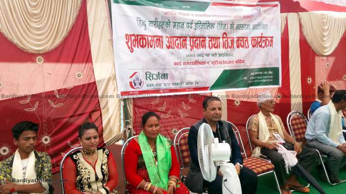 \"bardiya-700\"बर्दिया, १९ भदौ । आधुनिकताको नाममा तन्नेरी पुस्ताहरुले महंगा होटेल र पार्टी प्यालेसहरुमा डिस्को नाचेर तीज मनाइरहेको बेला बर्दियाका महिलाहरुले भने तीजको खर्च घटाएर बचत गर्ने संस्कारको सुरुवात गरेका छन् । स्थानीय सिर्जना सहकारी संस्थाले आयोजना गरेको तीज विशेष कार्यक्रममा बर्दिया भुरिगाउँका महिलाहरुले तीज बचत खाता खोलेर नयाँ कामको थालनी गरेका हुन् । तीज बचत खाता संञ्चालन गरेकै दिन उक्त सहकारीमा तीन सय महिलाले १७ लाख रुपैया बचत गरेको बताइएको छ । तीजको अवसमा खोलीएको उक्त खातामा महिलाहरुले पाँच सय देखि माथी बचत गरेका थिए । चाडपर्वको बेला हुुने फजुल खर्च कम गरि, संकलन गरेमा आवश्यक पर्दा पारीवार र छिमेकीको पनि समस्याहरु समाधान गर्न सकिने भएकोले उक्त बचत कार्यक्रम संञ्चालन गरेको संस्थाका अध्यक्ष दामोदर अधिकारीले बताए । अध्यक्ष अधिकारीले भने,महिलालाई बचत गर्ने काममा आर्कषण गर्नकालागि संस्थाले बार्षीक १० प्रतिशत ब्याजदरमा तीज बचत खाता संञ्चालनमा ल्याएको हो । सहकारी संस्थाले महिलालाई लक्षित गरी संञ्चालनमा ल्याएको उक्त तीज बचत खाताले ग्रामीण महिलाहरुलाई भविष्यमा आउन सक्ने घरायसी समस्या सहजरुपमा टार्न सघाउने बताउदै रानिपुर निवासी स्थानीय रानजीतिक दलकी नेतृ दुर्गा अधिकारीले सहकारीले तीजको अवसरमा राम्रो कार्यक्रम ल्याएको बताईन् । खवर डबलीसँग उनले भनिनन्, तीज बचत खाता संञ्चालनमा आएपछि त्यहाँका स्थानीय महीलाहरुले तीजको खर्च घटाएर बचत गर्ने बानीको विकाश गरेका छन्, यो अत्यन्त राम्रो कार्यको सुरुवात हो ।
