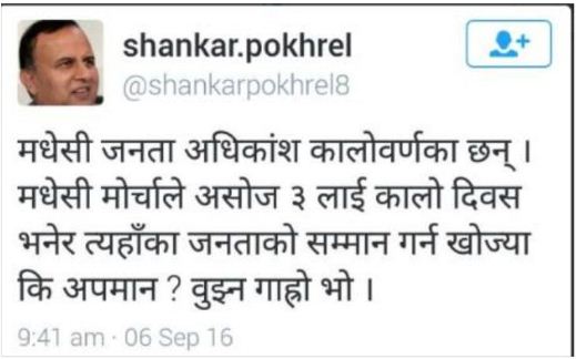 काठमाडौं, २१ भदौ । नेकपा एमालेका नेता शंकर पोखरेलले मधेसी जनताको अधिकांश कालो वर्णको भनेर होच्याएका छन् । सामाजिक सञ्जाल ट्वीटरमा ट्वीट गरी नेता पोखरेलले मधेसी जनता अधिकांश कालो वर्णको भएको भनी होच्याएका हुन् । मधेसी जनता अधिकांश कालो वर्णका भएकाले मधेसी मोर्चाले असोज ३ गतेलाई कालो दिवस मनाउन लागेको नेता पोखरेलले ट्वीट गरेका छन् । \"shankarमधेसी जनता अधिकांश कालो वर्णका भएकाले असोज ३ गतेलाई कालो दिवस मनाएर मोर्चाले मधेसी जनताको सम्मान गर्न खोजेको हो कि अपमान गर्न भनी पोखरेलले ट्वीट गरेपछि मधेसी समुदायका सामाजिक सञ्जाल प्रयोगकर्ताहरुले पोखरेलको आलोचना गरेका छन् । सामाजिक सञ्जालमा पोखरेलको आलोचना भएपछि उनले आफ्नो ट्वीट भने हटाएका छन् । तर उनले आफूले गल्ती गरेको भने स्वीकारेका छैनन् ।