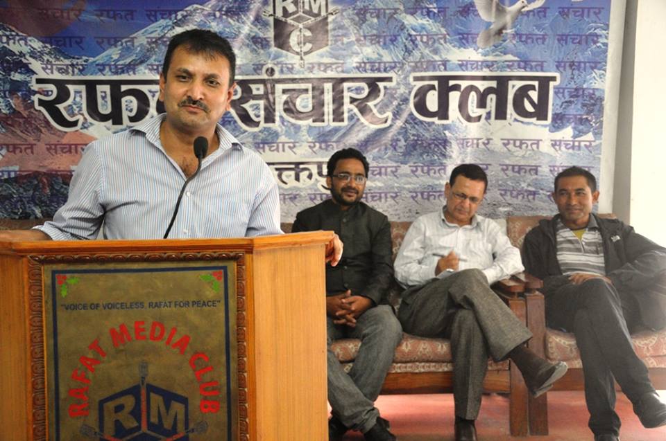 \"14256628_1048582505238434_443934020_n\"भक्तपुर, २३ भदौ । नेपाल पत्रकार महासंघका अध्यक्ष डा. महेन्द्र बिष्टले श्रमजीवि पत्रकारको न्यूनतम पारिश्रमिक बिषयमा सञ्चार गृहहरुले तत्कालै कार्यान्वयन नगरे महासंघले सञ्चार गृह केन्द्रित चरणबद्ध आन्दोलन गर्ने बताएका छन् । रफत सञ्चार क्लबले आयोजना गरेको साक्षतकार कार्यक्रममा बोल्दै बिष्टले लामो समय देखि सञ्चार जगत्मा चर्चाको बिषय बनेको श्रमजीवि पत्रकारको न्यनूतम पारिश्रमिकको बिषय तर्फ सञ्चार गृहहरुले कार्यान्वयन तर्फ ध्यान नदिएको भन्दै अब सञ्चार गृह केन्द्रित आन्दोलन गर्ने बताएका हुन् । बिष्टले पत्रकारका बिषयमा गरिएको बिमालाई अझ फराकिलो बनाउँदै लैजाने र सरकारले स्वास्थ्य क्षेत्रमा दिने भनेको ५० प्रतिशत छुटका बिषयमा समेत सम्बोधन नभएकाले यसको कार्यान्वयन तर्फ सरकारले तत्कालै कदम चाल्नु पर्नेमा जोड दिए । देश संघियतामा प्रवेश भईसकेकोले पत्रकार महासंघमा समेत ब्यापक परिवर्तन गर्नु पर्ने भएकाले बिधान संशोधनको तयारी भएको र यसको मूर्त स्वरुप छिटै देखा पर्ने भन्दै संबिधानको सफल कार्यान्वयनमा सञ्चार जग्तको भूमिकालाई ब्यापक पार्नु पर्ने बताए । नेपाल प्रेस काउन्सिलका अध्यक्ष बोर्ण बहादुर कार्कीले नेपालमा औंलामा गन्न मिल्ने सञ्चार माध्यम बाहेक अन्य मिडियाहरु आर्थिक संकटमा रहेको भन्दै मिडियालाई आर्थिक सवल पार्न नसके समस्या जस्ताको तस्तै रहने उनले बताए । सञ्चार क्षेत्रमा आउने क्रम जति बढेको छ त्यतिनै पाँच ६ बर्ष काम गरेको पछि आफ्नो भबिष्य नदेखेर बिलिन हुने क्रम समेत बढेको उनले बताए । यसरी नेपालको मिडियामा काम गरि जीवन जोह गर्न सक्ने अवस्था हाल सम्म पनि देखा पर्न नसकेको उनको भनाई छ । दूई प्रकारका सञ्चार गृह रहेको र एक सक्षम भएर पनि श्रमजीवि पत्रकारको न्यूनतम पारिश्रमिक उपलब्ध नगराउने र अर्को आर्थिक रुपमै असक्षम भएकाले न्यूनतम पारिश्रमिक उपलब्ध गराउन नसकेको अवस्था देखिएको उनले बताए । उनले केही ठूला सञ्चार गृहल फाइदामा रहेको र फाइदा भएको रकम सञ्चार क्षेत्र र सञ्चारकर्मीको बिकासमा भन्दा पनि अन्य ब्यवसायमा लागू गर्दा समस्या माथि समस्या थपिँदै गएको बताए । उनले सबै भन्दा कान्छो मिडिया भनेको अनलाईन सञ्चार माध्यम भएता पनि यो बाँदरको हातमा नरिवल बनेको भन्दै समाचारको राम्रो माध्यम भएता पनि यसलाई ब्यवस्थित गर्न नसक्दा यसको अपार भबिष्य संकटमा पर्न सक्ने अवस्था देखिएको उनको भनाई छ । कमिकम्जोरीलाई नियन्त्रण गर्दै यसको प्रर्वद्धनमा लागेको र कानुनी मान्यता दिलाउँदै पत्रकारीताको सामान्य नियम अनुसार नै सञ्चालन गर्नु पर्नेमा काउन्सिलको मान्यता रहेको उनले बताए । नयाँ आचार संहिताको लागूसँगै सञ्चार क्षेत्रलाई कमाई खाने 