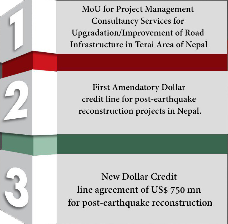 काठमाडौं , ३१ भदाै ।  प्रधानमन्त्री पुष्पकमल दाहाल प्रचण्ड र भारतीय प्रधानमन्त्री नरेन्द्र मोदीबीचको भेटवार्तापश्चात नेपाल र भारतबीच ३ बुँदे सम्झौता भएको छ । तराई सडक सञ्जालको स्तरन्नोति प्राजेक्ट म्यानेजमेन्ट र कन्सल्टेन्सी सेवा दिने, भूकम्पपछिको पूनर्निर्माणमा डलर क्रेडिट लाइन र भूकम्पपीडितका लागि ७५० मिलियन क्रेडिट लाइन सम्झाैता छन् । \"nepal_varat_3_bude\"