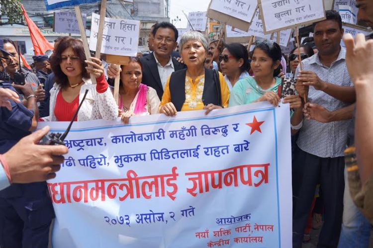 \"naya-shakti-rally\" काठमाडौं, २ असोज । नयाँ शक्ति नेपालले आन्दोलनरत दलहरुको माग सम्बोधन गर्न सर्वपक्षीय राजनीतिक संयन्त्र तत्काल गठन गर्न माग गरेको छ । संविधान संशोधनका लागि सरकारलाई दबाब दिने उद्देश्यले आइतबार सरकारलाई ज्ञापनपत्र बुझाउँदै उसले सर्वपक्षीय राजनीतिक संयन्त्र गठनको माग गरेको छ । सहसंयोजक रामचन्द्र झा र दुर्गा सोबको नेतृत्वमा दलबलका साथ सिंहदरबार पुगेको टोलीले आइतबार कार्यबाहक प्रधानमन्त्री बिमलेन्द्र निधिलाई ज्ञापनपत्र बुझाएको हो । मधेसी, जनजाति, थारु आदि समुदायको असन्तुष्टिलाई संविधानले सम्बोधन गर्न नसकेको भन्दै जायज माग सम्बोधन गरी संविधान संशोधन गर्न माग गर्दै नयाँ शक्तिले आइतबार सरकारलाई ज्ञापनपत्र बुझाएको छ । राजनीतिक पक्ष, आर्थिक सामाजिक पक्ष, भूकम्पपीडितलाई राहत तथा पुननिर्माण–नवनिर्माण, विकास–निर्माणतर्पm, राष्ट्रियता, शान्तिप्रक्रिया लगायतका विषयमा नयाँ शक्तिले ज्ञापनपत्र बुझाएको हो । त्यसैगरी, २०७४ साल माघ ७ गतेभन्दा अगावै स्थानीय तह, प्रादेशिक व्यवस्थापिका र संघीय संसदको चुनाव सम्पन्न गर्न सरकारको तर्पmबाट गम्भीरता र कार्यतत्परता देखाउनुपर्ने माग गरेको छ । ज्ञापनपत्रमा संविधान संशोधनमार्फत पूर्ण समानुपातिक संसद र प्रत्यक्ष निर्वाचित कार्यकारी राष्ट्रपतिको व्यवस्था गर्न, पहिचानका पाँच र सामाथ्र्यका चार साथै समानुपातिक र समावेशीताका आधारमा स्थानीय तहको पुनर्संरचना गर्नसमेत माग गरिएको छ । आर्थिक विकास र समृद्धिका लागि अल्पकालीन, मध्यकालीन र दीर्घकालीन ठोस कार्ययोजना निर्माण गरी काम गर्न पनि नयाँ शक्तिले सरकारसँग माग गरेको छ । राष्ट्रिय प्राथमिकता प्राप्त आयोजना र राष्ट्रिय गौरबका आयोजना कार्यान्वयनलाई प्रभावकारी बनाउनु उसले सरकारलाई सुझाएको छ । सार्वजनिक यातायातलाई व्यवस्थित र सुरक्षित बनाउँदै बजारमा व्याप्त कालोबजारी र महंगी नियन्त्रण गर्न देशभर स्पेशल टाक्स फोर्स ‘एसटीएफ’ बनाउन पनि नयाँ शक्तिले सरकारसँग माग गरेको छ । महिला, दलित, बालबालिका, यौनिक तथा लैंगिक अल्पसंख्यकमाथि भइरहेको हिंसा मानवअधिकार विरुद्धको गम्भीर अपराध भएकोले तत्काल यसको अन्त्य गर्न कठोर कदम चाल्नससमेत सरकारसमक्ष माग गरेको छ । ज्ञापनपत्र बुझाउनु अघि अनामनगरमा आयोजित कोण सभालाई सम्बोधन गर्दै संगठन विभाग प्रमुख देवेन्द्र पौडेलले जनताका दैनिकीसँग सम्बन्धित आफ्ना मागहरुलाई तुरुन्त पूरा नगरे आफूहरु अझ सशक्त आन्दोलनमा उत्रिने चेतावनी दिएका थिए । नयाँशक्ति पार्टीले आइतबार ७५ वटै जिल्लाहरुमार्फत प्रधानमन्त्रीलाई ज्ञापनपत्र बुझाएको जनाएको छ ।