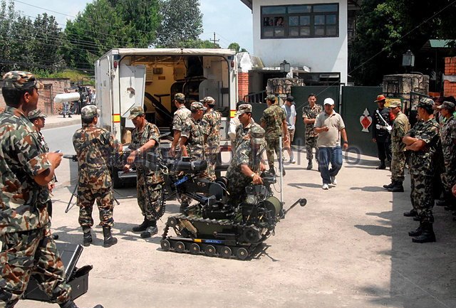 \"army_dispocial\"काठमाडौं, ४ असोज । मंगलबार बिहान एकाएक राजधानिका दश स्थानभन्दा बढीमा बम भेटिएको हल्ला चलेको छ भने केही स्थानमा शंकास्पद बस्तु भेटिएको समेत छ । प्रहरीका अनुसार ललितपुरको रेडियन्ट स्कुल, काठमाडौंको डल्लुस्थित कञ्चजजंघा स्कुल, बौद्धस्थित राई स्कुल, आकाशदीप स्कुल, इस्टपोल स्कुल र बौद्ध दक्षिणढोकास्थित मनोकामना स्कुल लगाएतमा बम राखिएको हल्ला मच्चिएको हो । प्रहरी उपरिक्षक प्रधुम्न कार्कीले केही स्थानमा शंकास्पद बस्तु भेटिएको बताएका छन् । उनले भने,–‘केही शंकास्पद वस्तु भेटिएको छ। हामी परीक्षण गरिरहेका छौं,’ । अखिल नेपाल राष्ट्रिय स्वतन्त्र बिद्यार्थी केन्द्र र योङ कम्युनिष्ट फोर्स नेपालको संयुक्त अपिल नामक पर्चामा वार्षीक २ लाख ४० हजार भन्दा कम आय भएका नागरिकका बालबालिकालाई निजी विद्यालयमा निशुल्क पढाउन , नीजि विद्यालयले सरकारी पाठ्यपुस्तक अनुसार अध्ययन अध्यापन गराउनुपर्ने, विद्यालयले तोकेको स्थानबाट मात्र ड्रेस पुस्तक लगायत सामाग्री ल्याउने पर्ने अवस्था अन्त्य गर्न माग गरेको छ । बम भेटिएका भनिएका स्थानहरुमा प्रहरीले योङ कम्युनिस्ट फोर्स नेपालका केही पर्चा भेटिएको र केही व्यक्तिलाई पक्राउ गरि अनुसन्धान अघि बढाएको बताएको छ ।