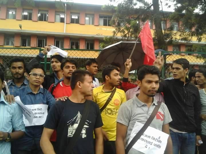 \"anjila_krantikari\"काठमाडौं, ५ असोज । गोरखाकी छात्रा एन्जेला गिरीको हत्याको विरुद्ध त्रि(चन्द्र क्याम्पस अगाडि विद्यार्थीहरुले चक्काजाम सहित प्रदर्शन गरेका छन् । प्रदर्शनकारीले गिरीका हत्यारा अविनाश भारतीलाई हदैसम्मको कार्वाहीको माग गरेका छन् । अखिल (क्रान्तिकारी) त्रिचन्द्र क्याम्पस इकाईको अगुवाईमा आज विहान एकघण्टे चक्काजाम सहितको विरोध प्रदर्शन पछि कोणसभा गरिएको थियो । कोणसभामा क्रान्तिकारीका केन्द्रीय सदस्य एकराज केसिले हत्यारालाई मृत्युदण्डको सजाय दिनुपर्ने माग गरेका थिए। विरोध प्रदर्शनका क्रममा किर्तिपुरमा हत्या गरिएकी गिरीको परिवारलाई राहत तथा क्षतिपूर्तिको समेत माग गरिएको विद्यार्थी नेता केसीले वताए।