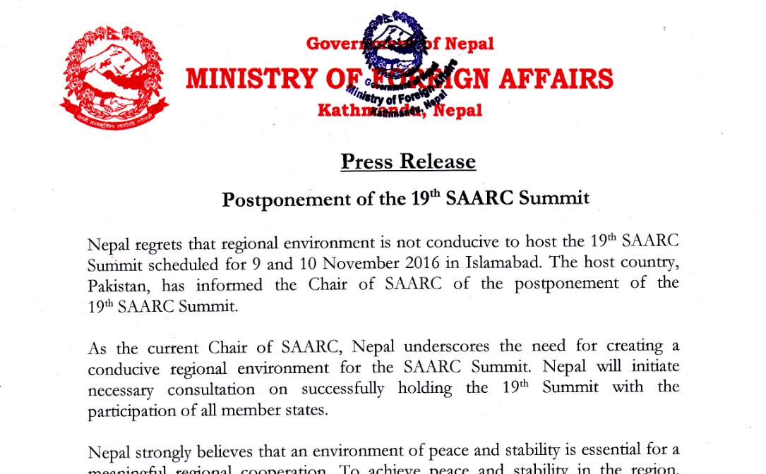 भारतलाई सरकारको अर्को धक्का, सार्क सम्मेलन स्थगित हुनु दुःखद भएको सरकारको धारणा