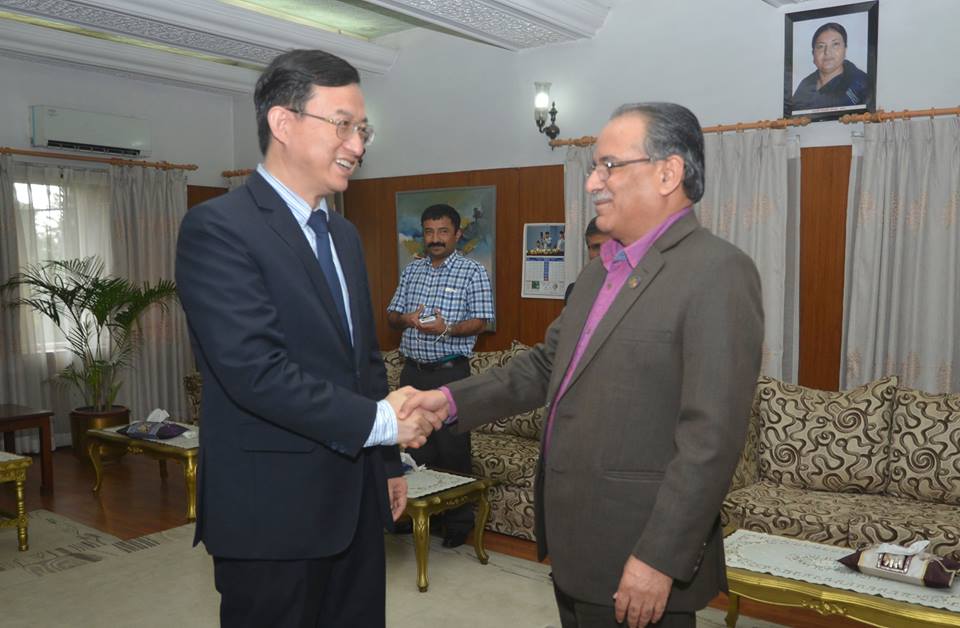 \"14610756_1120063988040991_1570161376_n\"काठमाडौं, १९ असोज । नेपालका लागि चीनियाँ राजदूत हु–चुन ताइले प्रधानमन्त्री पुष्पकमल दाहाल ‘प्रचण्ड’सँग बिदाइ भेट गरेका छन् । बुधबार प्रधानमन्त्री निवास बालुवाटारमा भएको भेटमा राजदूत ताइले आफ्नो ३ वर्ष ८ महिनाको कार्यकालमा नेपालबाट अत्यन्तै राम्रो र सकारात्मक सहयोग पाएको बताए । राजदूत ताइले भने, ‘मेरो ३ वर्ष ८ महिनाको कार्यकालमा नेपालबाट अत्यन्तै राम्रो, न्यानो र सकारात्मक सहयोग पाएँ । सम्माननीय प्रधानमन्त्रीज्यूबाट भएको सहयोग र सद्भाव निकै महत्वपूर्ण छ । यसले नेपाल–चीन सम्बन्ध अझै प्रगाढ बनाएको छ ।’ ताइले आफ्नो कार्यकालमा नेपाली जनताको न्यानो माया पाएको बताउँदै आफू चीन फर्केपछि नेपालको जलविद्युत्, रेलमार्ग लगायतका भौतिक विकासका लागि चीन सरकारसँग कुरा गर्ने बताए । ताइले नेपाल राजनीतिक रुपमा सही दिशामा अगाडि बढेको बताउँदै संविधान कार्यान्वयन र आर्थिक समृद्धिका लागि नेपाललाई सफलता मिल्ने विश्वास व्यक्त गरे । भेटमा प्रधानमन्त्रीले आफ्नो कार्यकालमा राजदूत ताइले खेलेको सकारात्मक, कुटनीतिक र सौहार्द सम्बन्धका लागि धन्यवाद दिँदै ताइको कार्यकालमा नेपाल–चीन सम्बन्ध थप उचाईमा पुगेको बताए ।