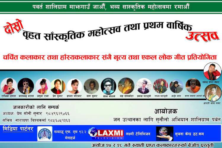 पर्वत, २३ असोज । पर्वतको सुदुर दक्षिणमा पर्ने शालिग्राम गाविस र वहाकी गाविसको सिमाना ठाँटीमा जनउत्थानका लागी सुनौलो अभियान शालिग्राम पर्वतले आफ्नो बृहत दोस्रो साँस्कृतिक महोत्सव तथा प्रथम वार्षिक उत्सव मनाउने भएको छ । संस्थाले यहि आउदो असोज २६, २७ र २८ गते ख्याती प्राप्त राष्ट्रिय कलाकार तथा हाँस्यकलाकारहरुको साथमा नृत्य प्रतियोगीता तथा एकल लोक गीत प्रतियोजीता पनि आयोजना गर्ने भएको छ । यहि आउदो असोज २६ गते नृत्य प्रतियोगीताको दर्ता, कलाकारहरुको प्रस्तुती, असोज २७ गते नृत्य प्रतियोगीता, ख्याती प्राप्त कलाकारहरुको वेजेड प्रस्तुती, असोज २८ गते कलाकारहरुको प्रस्तुती संगै पुरस्कार वितरण तथा सम्मान आयोजाना गरिएको आयोजकले जानकारी गराएको छ । \"palpa_saskritik-750\"नृत्य प्रतियोगीतमा पहिलो हुनेलाइ १० हजार, दोस्रो हुनेलाइ पाँच हजार, तेस्रो हुनेलाइ २५ सय र सान्त्वना हुनेलाइ १५ सय शिल मेडल र प्रमाण पत्र प्रदान गरिने भएको छ । एकल नृत्य प्रतियोगीता तर्फ पहिलो हुनेलाइ दुइ हजार, दोस्रो हुनेलाइ एक हजार र तेस्रो हुनेलाइ एक पाँच सय रुपया पुरस्कार कायम गरिएको छ । ज्न उत्थानका लागी सुनौलो अभियान शालिग्राम पर्वतका अध्यक्ष प्रेम सोनी सुनारले संस्थाले यस वर्ष भलिवल प्रतियोगीताको आयोजना नगरेको जानकारी दिदैँ साँस्कृतिक कार्यक्रम भने गत वर्ष भन्दा भव्य र दम्दार बनाउने लक्ष्य राखेको स्पष्ट पारे । उहाले कार्यक्रम सफल बनाउन सम्पुर्ण युवाहरु एकताको सुत्रमा बाँधिदै गएको र संस्थाले आयोजना गरेको गैरवमय कार्यक्रमलाइ सफल बनाउन सवैलाइ साथ दिन अपिल गरे । उहाले देशमा तथा विदेशमा रहेका विभिन्न शालिग्रामका युवाहरुसंग कार्यक्रमको विषयमा छलफल तिव्र गतिमा अगाडी वढाइएको जानकारी दिए । उत्थानका लागी सुनौलो अभियान शालिग्राम पर्वतका सचिव नारायण विश्वकर्माले कार्यक्रममा नेपाली लोक दोहोरी मा चर्चित राष्ट्रिय तथा स्थानीय कलाकारहरु राधिका हमाल, बालचन्द्र वराल, जमुना राना, सान्ता परियार, याम सुनार, चेतन गोतामे, यज्ञ सापकोटा, प्रकाश पराजुली, तिलव विश्वकर्मा, माधव पराजुली, अर्जुन थापा, नृत्य निर्देशक तथा मोडेल एकेन्द्र सारा संकर, नृत्यकार तथा मोडेल आरुसी थापामगर हाँस्य कलाकार कमल वस्याल चटपटे वा लगाएतको उपस्थती रहने जानकारी दिए । विश्वकर्माले कार्यक्रममा विभिन्न क्षेत्र तथा पेसामा आबद्ध बौद्धिक व्यक्तिहरुको उपस्थिती रहने पनि जानकारी दिनुभयो । “कार्यक्रम अहिले सम्मकै भव्य र सभ्य हुन्छ” विश्वकर्माको दावी छ । विश्वकर्माले कार्यक्रममा नेपाल अधिराज्यमा रहेका तथा विदेशमा छरीएर रहेका नेपालीहरुलाइ सहभागीता जनाउन पनि आग्रह गरेका छन् । शालिग्राम वासी र शालिग्राममा जन्मेर हाल देश भन्दा 