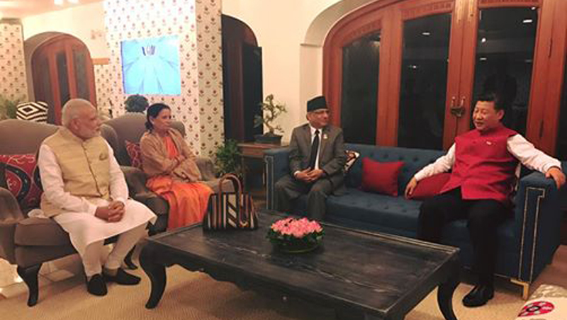\"pm-prachanda-xi-modi\" नयाँ दिल्ली, ३० असोज । भारतको गोवामा चिनिया राष्ट्रपति सी जिनपिङको साथ प्रधानमन्त्री पुष्पकमल दाहाल ‘प्रचण्ड’ले होटलको एउटा कोठामा अनौपचारिक रुपमा गोप्य छलफल गरिरहेका थिए । दुई देशका प्रमुखबीच द्विपक्षीय वार्ता भइरहँदा अचानक भारतीय प्रधानमन्त्री नरेन्द्र मोदी पनि पुगे । दुई देशका प्रमुखबीच द्विपक्षीय वार्ता भइरहँदा मोदी अचानक छिरेपछि त्रिपक्षीय वार्ता शुरु गरिएको थियो । तीन देशका प्रमुखबीचको वार्ताका क्रममा प्रधानमन्त्री प्रचण्डले ठूला तथा विश्वकै शक्ति राष्ट्रले नेपालको विकाशमा गरेको योगदानको प्रशंशा गरे । नेपाल, चीन र भारत मात्र भौगोलिक सीमाले मात्र जोडिएको नभइ हिमालय तथा बुद्धको कारणले पनि एक आपसमा जोडिएको भेटका क्रममा भारतीय प्रधानमन्त्री मोदीले उल्लेख गरे । नेपाललाई आर्थिक रुपले समृद्ध बनाउनका लागि त्रिदेशीय सम्बन्धलाई अझै मजबुत गर्नुपर्ने चिनिया राष्ट्रपति जिनपिङले उल्लेख गरे । चिनिया राष्ट्रपति सिले पर्यटन, जलविद्युत तथा सडक विकासमा साझा रुपले काम गर्नुपर्ने आवश्यकता रहेको बताए ।