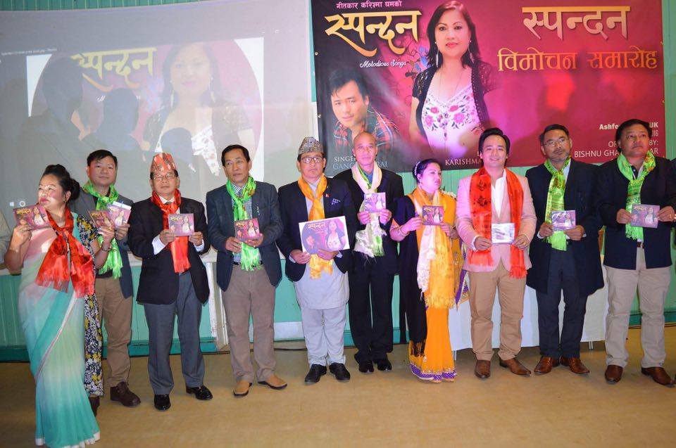 \"14658286_1475996462427349_787529363_n\"काठमाडौं । विदेशमा बसेर नेपाली गीत संगीतलाई माया गर्नेहरुको संख्या निकै ठूलो रहेको छ । त्यस्तै वेलायत बसेर नेपाली सांगीतिक आकाशामा आफूलाई समाहित गरेकी गीतकार करीश्मा घम हालै एकल एल्वम् ‘स्पन्दन’ लिएर आएकी छिन् । उनको एकल शब्द र गायक गंगाराज राईको एकल स्वर रहेको उक्त एल्वमलाई बेलायतमै सार्वजनिक गरिएको छ । केनिन्टोन आश्फोर्डस्थित बोक हाङ्गर कम्युनिटी हलमा हालै आयोजित एक समारोहवीच एल्वम सार्वजनिक गएिको थियो । कार्यक्रममा प्रमूख अतिथि तथा राप्ति समाज वेलायतका अध्यक्ष हिक्मतसिं रोकालगायतले एल्वम विमोचन गरेका थिए । कार्यक्रममा बोल्दै प्रमुख अतिथि हिक्मत सिहं रोकाले गायक र गीतकारले बेलायतमै बसेर पनि नेपाली गीत संगीत र साहित्यमा सशक्त रुपले योगदान गर्दै आएको र उक्त कार्य प्रशंसा र कदरयोग्य रहेको बताएका थिए । उनले मन्तव्यको क्रममा गंगा राज राईको गायकी र करीश्मा घमको लेखनलाई प्रशंसा गरेका थिए । कार्यक्रममा साहित्यकार विजय हितानले एल्वममाथि आफ्नो समिक्षात्मक टिप्पणी राखेका थिए भने गीतकार र गायकले एल्वम तयारीका क्रममा संगालेका आ—आफ्ना अनुभव सुनाएका थिए । कार्यक्रममा बेलायतमा रहेका विभिन्न संघ सस्थाका पदाधिकारीहरु र समाजका अगुवाहरुको उपस्थित रहेको थियो । \"spandan1\" करीश्मा घमले यसअघि ‘मुटु’ नामक एकल एल्वम ल्याएकी छन् भने गंगाराज राईको ‘आभास’ र ‘उपमा’ नामक गीति एल्वम् प्रकाशित छन् । नेपालमा रहँदा ६ बर्ष शास्त्रीय संगीत अध्ययन गरेका गंगाराज हाल बेलायतमै संगीत अध्यापन समेत गराइरहेका छन् । गंगाराजलाई ‘वेलायतबाट उदाएका चम्किला तारा’को उपमा दिने गरिएको छ । विमोचन समारोहमा एल्वममा रहेको ‘आँखाभरि तिम्रै तस्वीर’ बोलको गीतको म्युजिक भिडियो समेत सार्वजनिक गरिएको थियो । म्युजिक भिडियोमा अनु शाह र संजोग राणाले अभिनय गरेका छन् भने कपिल लामाको कोरियोग्राफि रहेको छ । एल्वममा ‘रोज्यो यो मनले’, ‘आँखाभरि तिम्रै तस्वीर’, ‘चङ्गा झैँ’, ‘भुल्दिन भुल्नै सक्दिन’, ‘म कोमल कोपिला’ र ‘आऊ न प्रिय’ गरी ६ गीत समावेश गरिएको छ भने महेश खडका, गंगाराज राई, कल्याण सिंह र वसन्त सापकोटाले संगीत दिएका छन् ।