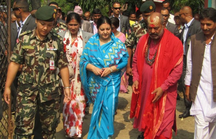 \"bidhya-bhandari\" राजविराज ६ कात्तिक । राष्ट्रपति विद्यादेवी भण्डारीले नेपाल अहिले शान्ति, स्थिरता र सभ्यताको पथमा अगाडि बढेको बताएकी छन् । सप्तरीको छिन्नमस्ता गाबिसस्थित प्रसिद्ध छिन्नमस्ता भगवतीको दर्शन र विशेष पुजापाठ तथा मन्दिर परिसरमा हुने लक्ष्यचण्डी रुद्र महायज्ञको हवन कुण्डको शिलान्यासपछि आयोजित कार्यक्रममा राष्ट्रपति भण्डारीले नेपाल अहिले शान्ति, स्थिरता र सभ्यताको पथमा अगाडि बढेको बताएकी हुन् । समारोहमा राष्ट्रपति भण्डारीले धार्मिक, साँस्कृतिक र जातीय विविधताले भरिपूर्ण नेपालका प्रत्येक नागरिक कुनै पनि भेदभाव नराखी शान्ति एवम् मानवकल्याणमा लाग्नुपर्ने बताइन् । उनले दुई दशकदेखि मुलुकमा विद्यमान अस्थिरता, भेदभाव र द्वन्द्वले कसैलाई हित नहुने हँुदा त्यसलाई त्यागी सबैले विकासको बाटो अपनाउनुपर्नेमा जोड दिइन् । समारोहअघि राष्ट्रपति विद्यादेवी भण्डारीले छिन्नमस्ता गाविसमा रहेको छिन्नमस्ता भगवती मन्दिरमा विशेष पूजापाठ गरेकी थिइन् । उनले मन्दिर परिसरमा रहेका शिव, नारायण तथा हनुमान मन्दिरमा पनि पूजाअर्चना गरिन् । सो अवसरमा राष्ट्रपतिद्वारा मन्दिरका पीठाधीश महाकान्त ठाकुरबाट टीका र प्रसाद ग्रहणसमेत गरिन् । मन्दिरको पूजापछि राष्ट्रपति भण्डारीले मन्दिर परिसरमा राष्ट्रिय शान्ति मानवकल्याण हेतु नेपालमा प्रथम पटक हुन लागेको एक हजार आठ लक्ष्यचण्डी रुद्रमहायज्ञको मण्डप शिलान्यास गरेकी थिइन् । समारोहमा मन्दिरका पीठाधीश ठाकुर र छिन्नमसता गाविसका पूर्वअध्यक्ष सत्यनारायण यादवले राष्ट्रपतिको स्वागत गर्दै अभिनन्दनपत्र चढाएका थिए ।
