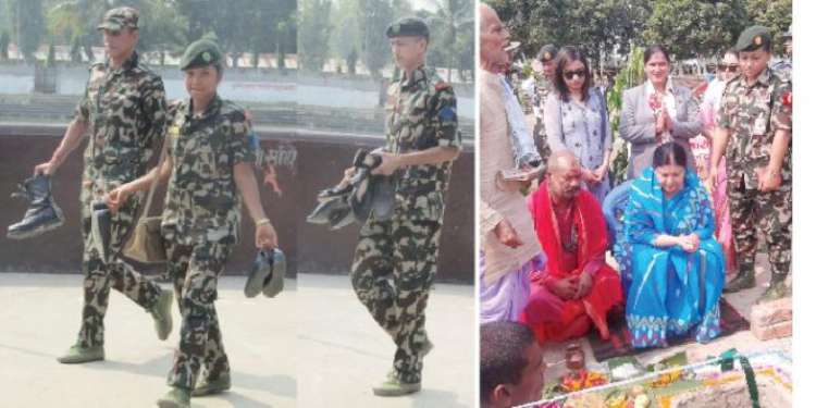\"jutta-750\"सप्तरी, ७ कात्तिक । राष्ट्रपति विद्यादेवी भण्डारीले शनिबार सप्तरीको सखडास्थित प्रसिद्ध छिन्नमस्ता भगवती शक्तिपीठमा पूजाआजा गरेकी छन् । हेलिकोप्टरमा परिवारका सदस्यसहित भण्डारी छिन्नमस्ता पुगेकी हुन् । आजको नयाँ पत्रिकामा खबर छ– हेलिकोप्टरबाट ओर्लेपछि करिब दुई सय मिटर पैदल हिँडेर राष्ट्रपति भण्डारी र उनका दुई छोरी उषाकिरण र निशाकुसुम मन्दिर परिसरमा पुगे । जहाँ सेना, सशस्त्र, नेपाल प्रहरी, तालिमप्राप्त कुकुर र राष्ट्रपति कार्यालयको विशेष सुरक्षा टिम परिचालित थियो । सेनाका चार जवान भने राष्ट्रपति र उनका छोरीहरुका जुत्ता–चप्पल बोक्न ब्यस्त थिए । उपल्ला सैनिक अधिकारी र राष्ट्रपति कार्यालयका कर्मचारीका जुत्ता–चप्पल बोक्ने काम पनि सेनाका जवानले गरेका थिए । मन्दिरको प्रवेशद्वार छेउमा राखिएका जुत्ता–चप्पल सेनाका जवानले त्यहाँबाट बोकेरमन्दिरको निकासद्वारसम्म पु(याए । जुत्ता–चप्पल बोक्ने कामका खटाइएका सैनिकको तस्वीर खिचिरहेका सञ्चारकर्मीलाई सेनाका उच्च अधिकारीले निकासद्वाराबाट हटएका थिए ।