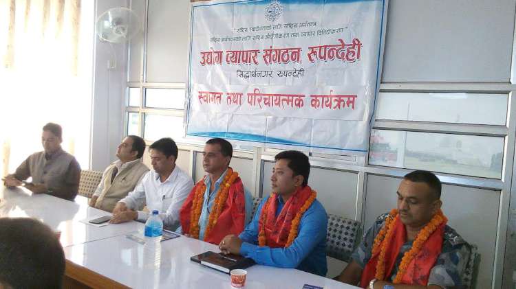\"rupandehi-750\"भैरहवा, ९ कात्तिक । उद्योग व्यापार संगठन रुपन्देहीले नव आगन्तुक सरकारी कार्यालयका प्रमुखहरुलाई स्वागत तथा परिचयात्मक कार्यक्रम सम्पन्न गरेको छ । संगठनले सिद्धार्थनगर नगरपालिकाका प्रमुख एवं कार्यकारी अधिकृत गोपाल प्रसाद रेग्मी, भैरहवा भन्सार कार्यालयका प्रमुख भोपाल राज शाक्य र सशस्त्र सीमा सुरक्षा कार्यालय भैरहवाका प्रमुख एसपी बेनु प्रसाद पाठकलाई स्वागत गरेको हो । व्यापार संगठनका अध्यक्ष नारायण प्रसाद भण्डारीको अध्यक्षतामा सम्पन्न कार्यक्रममा तीन वटै सरकारी कार्यालयका प्रमुखहरुले स्थानीय जनता र यस क्षेत्रका उद्योगी तथा व्यवसायीसंग सहयोग र सहकार्य गरेर अगाडी बढ्ने प्रतिबद्धता व्यक्त गरे । कार्यक्रममा अध्यक्ष भण्डारीले उद्योगी व्यवसायीहरुको साझा संस्था रहेको यस संस्थाले विगत देखि नै सरकारी कार्यालयहरुसंग समन्वय गरी कार्यहरु गर्दै आएको जनाउदैं आगामी दिनमा पनि यसलाई निरन्तरता दिने बताए । त्यसै गरी कार्यक्रममा वक्ताहरुले सिद्धार्थनगरमा ट्राफिक व्यवस्थापन, सार्वजनिक शौचालय लगायतका प्रमुख समस्याहरु विद्यमान रहेको औल्याउदै यसको समाधान गर्न कार्यालय प्रमुखहरुको ध्यानाकर्षण गराएका थिए । संगठनका उपाध्यक्ष गिरीश चन्द्र त्रिपाठीको स्वागत मन्तव्य तथा महासचिव अनिल कुमार ज्ञवालीको सञ्चालनमा सम्पन्न कार्यक्रममा निर्वतमान अध्यक्ष मनिष कुमार जोशी, संगठनका तिलोत्तमा शाखा अध्यक्ष दीपक गैरे, कोषाध्यक्ष सचिन रोक्का, सह–कोषाध्यक्ष टीकाराम भट्टराई, सल्लाहकार चोपलाल आचार्य, रामु अधिकारी, कानूनी सल्लाहकार जगत रायमाझी, सचिवालय सदस्य राम चन्द्र रेग्मी, राम मिलन यादव, कार्यसमिति सदस्य अब्दुल कैयम खान, फैज अहमद खान लगायतको उपस्थिीति रहेको थियो ।