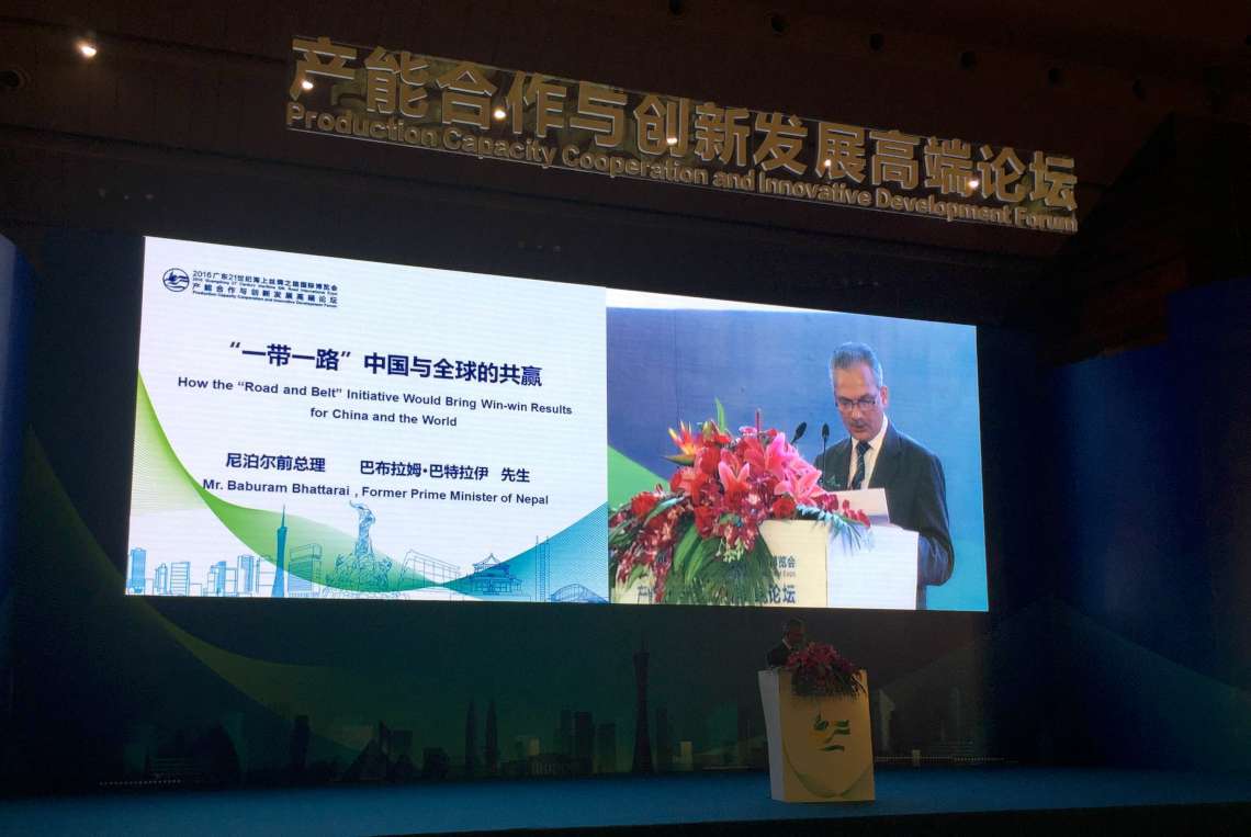 चीनको ग्वान्झाओमा भइरहेको \"21st Century Maritime Silk Road International Expo\" मा पूर्वप्रधानमन्त्री तथा नयाँ शक्ति पार्टी, नेपालका संयोजक डा. बाबुराम भट्टराईले  ‘वान–वेल्ट, वान–रोड’ का विषयमा दिनुभएको व्याख्यानको नेपाली भावानुवाद \"baburam-chinainteraction-1140\"विगत दशकहरुमा एशिया सामाजिक(आर्थिक विकासमा पछाडि परेको थियो । तर अहिले विश्व अर्थतन्त्रको केन्द्रबिन्दू नै एशिया बन्दैछ । अब हामीले विश्वव्यापी रूपमा सोच्नुपर्दछ ( बिगतको सफलता र असफलताको घेरा भन्दा पर । एशियाले विश्वलाई हाँक्नको निम्ति, एशिया केन्द्रित विश्वव्यापी जडानलाई नै अहिलेको प्रमुख आवश्यकता मान्नुपर्ने हुन्छ । यस सन्दर्भमा चीनले पहल गरेको एक(पेटी(एक(मार्ग योजनाले एशियाली राष्ट्रहरुलाई जोड्न निक्कै योगदान पुर्याउनेछ । ‘एक–पेटी, एक–मार्ग’ योजनासँगसँगै समुद्री रेशम मार्गले एशियालाई बाँकी विश्वसित जोड्ने कार्यलाई थप वृद्धि गर्नेछ र सहज बनाउनेछ । यसले निश्चय नै एशियाका प्रत्येक देशलाई बृहत लाभ पुर्याउनेछ र कालान्तरमा यी एशियाका गौरव परियोजना बन्नेछन् । हिमाली भेगहरुलाई जोड्ने बहस उठाउँदा यो सधैं भौतिक प्रतिकूलतारबाधाहरुको बिषयसित टकराउने गर्दछ । तथापी इतिहासले हामीलाई अर्कै वास्तविकता देखाउँछ । विगतमा यही हिमाली भेगमा रेशम मार्गका हाँगाहरु सहित थुप्रै व्यापार मार्गहरु हुने गर्दथे जसले नेपाल हुँदै चीन र भारतलाई जोड्दथ्यो । अहिले पनि दुई उदाउँदा अर्थतन्त्र चीन र भारतबीच आर्थिक र भौतिक सम्बन्ध र तालमेल बढ्नु नै शक्तिको सबभन्दा ठूलो श्रोत हुनेछ । र मलाई गर्व छ कि म आफैं प्रधानमन्त्री हुँदा मैले नै भारत र चीनबीच नेपालले एउटा जीवन्त पूलको भूमिका निर्वाह गर्नुपर्दछ र गर्नसक्नेछ भन्ने बहसको शुरुवात गरेको थिएँ । अब भौगोलिक प्रतिकूलताको बिषयले हामीलाई अड्काइराख्न मिल्दैन । आधुनिक पूर्वाधार प्रविधिले हाम्रा सामु थुप्रै समाधानहरु पस्किसकेका छन् । अत्यन्त दुर्गम र निर्माण गर्न असम्भव ठानिएका स्थानलाई पनि आधुनिक रेल प्रविधिद्वारा कसरी जोड्न सकिन्छ भन्ने उदाहरण चिन्घाई–तिब्बत रेलमार्गले देखाइसकेको छ । त्यसकारण, रेल र राजमार्गद्वारा चीनको तिब्बत स्वायत्त क्षेत्र र नेपाललाई जोड्न र सम्भवतः भारतसम्म विस्तार गर्न० दुवै प्राविधिक र आर्थिक रूपले सम्भव छ । तसर्थ चीन–भारत–नेपाल आर्थिक करिडोरको कुरा गर्दा भौगोलिक प्रतिकूलताको पुरानै अवधारणा अब असान्दर्भिक भैसकेको छ । नेपाल र चीनबीच यातायात सम्बन्ध बढाउनुपर्ने विषय पारवहन खर्च कटौती गर्ने अथवा व्यापार वृद्धि गर्नेसित मात्र सम्बन्धित छैन । वास्तवमा यो त हिमाली भेगका दुवैपट्टिका क्षेत्रहरूको अर्थतन्त्रको मूलभूत संरचनामै महत्वपूर्ण सुधार ल्याउने बिषयसि