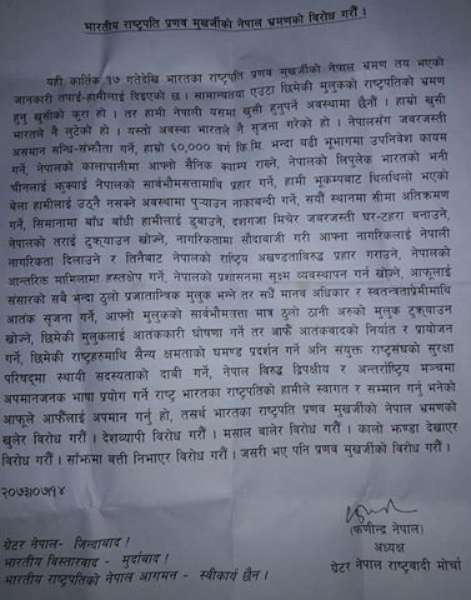 काठमाडौं, १४ कात्तिक । भारतीय राष्ट्रपति प्रवण मुखर्जीको आसन्न नेपाल भ्रमणको कार्यक्रम राष्ट्रहीत विपरित भएको भन्दै ग्रेटर नेपाल राष्ट्रवादी मोर्चाले त्यसको व्यापक विरोध गर्ने बताएको छ । भारतीय राष्ट्रपतिको नेपाल आउने कार्यक्रम नजिकीएको बेला ग्रेटर नेपाल राष्ट्रवादी मोर्चाले विज्ञप्ती मार्फत उनको भ्रमण राष्ट्रिय हितमा नभएको विभिन्न तर्कहरु प्रस्तुत गर्दै भ्रमणको विरोध गर्ने जनाएको हो । मोर्चाले उनको भ्रमणमा कस्तो खालको विरोध कार्यक्रम गर्दैछ भन्ने कुरा स्पष्ट खुलाएको छैन तर सबैलाई त्यो भ्रमणको खुलेर विरोध गर्न आग्रह गरेको छ । [caption id=\"attachment_99278\" align=\"alignleft\" width=\"371\"] .[/caption] मोर्चाका अध्यक्ष फणीन्द्र नेपालद्धारा हस्ताक्षर गरिएको विज्ञप्ती पत्रमा भनिएको छ–‘सामान्यतया एउटा छिमेकी मुलुकका राष्ट्रपतिको भ्रमण हुनु खुशीको कुरा हो । तर भारतले असमानपूर्ण सन्धि सम्झौताको आडमा हाम्रो ६० हजार वर्ग किलोमिटर भन्दा बढी भूभाग माथि जबरजस्त आफ्नो उपनिवेश कायम गरिराखेको छ । यस्तो अवस्थामा उनको भ्रमणले हामी खुशी हुनुपर्ने अवस्थामा छैनौ ।’ मोर्चाले भनेको छ–‘नेपाल विरुद्ध गतिविधी गरिरहेको भारतीय सरकार अनी अन्तर्राष्ट्रिय मञ्चमा अपमानजनक भाषा प्रयोग गर्ने भारतीय राष्ट्रपति मुखर्जीको हामीले स्वागत र सम्मान गर्नुपर्ने आवश्यकता छैन । उनलाई सम्मान गर्नु नेपालमाथीको अपमान हो । तसर्थ उनको भ्रमणलाई मसाल बालेर,कालो झण्डा देखाएर,साँझमा बत्ती निभाएर,जे जसरी हुन्छ देशव्यापी विरोध गरौं ।’ भारतले नेपालको कालापानी,सुस्ता लगाएतका क्षेत्रमा सैनीक क्याम्प खडागरी तर्साएको,लिपुलेकमाथी दाबी गर्न खोजेको,भूकम्पकै बेला नाकाबन्दी गरेको,सयौं स्थानमा सीमा अतिक्रमण गरेको,सीमा बाँधका कारण डुबानमा पारेको, दश गजा मिचेर नेपालमाथी आफ्नो हैकम जमाउन खोजेको र नेपालको सार्वभौमसत्तामाथि नै गम्भिर प्रहार गर्ने गतिविधी गरिरहेको आरोप लगाउदै मोर्चाले भारतीय राष्ट्रपतिको भ्रमणलाई विरोध गर्ने जनाएको छ । विरोधको स्वरुप कस्तो हुन्छ भन्ने विषयमा खबरडबलीसँग कुरा गर्दै मोर्चाका अध्यक्ष नेपालले भने–‘उनको नेपाल भ्रमणलाई सरकारले जसरी ठूलो सम्मान दिन खोजेको देखिन्छ, हामीले त्यो आवश्यक छैन र मुलुको हीत विपरीत छ भनेका छौ । नेपालको भूमिमाथी विभिन्न ढंगले आफ्नो शासन लाद्न खोज्ने राष्ट्रप्रमुखको भ्रमणलाई राष्ट्रवादी साथीहरुले विभिन्न ढंगले विरोध गर्छन । कालो झण्डा देखाउने देखि मसाल जुलुस निकाल्ने वा कुनै पनि तरिकाले हामी उनको विरोध गछौ । हामीले यही निर्णय गरेका छौ ।’ भारतीय राष्ट्रपति मुखर्जी यहि कार्तिक १७ गते नेपालको राजकिय भ्रमणमा काठमाडौ आउने कार्यक्रम तय भएको छ । उनी काठमाडौमा उ